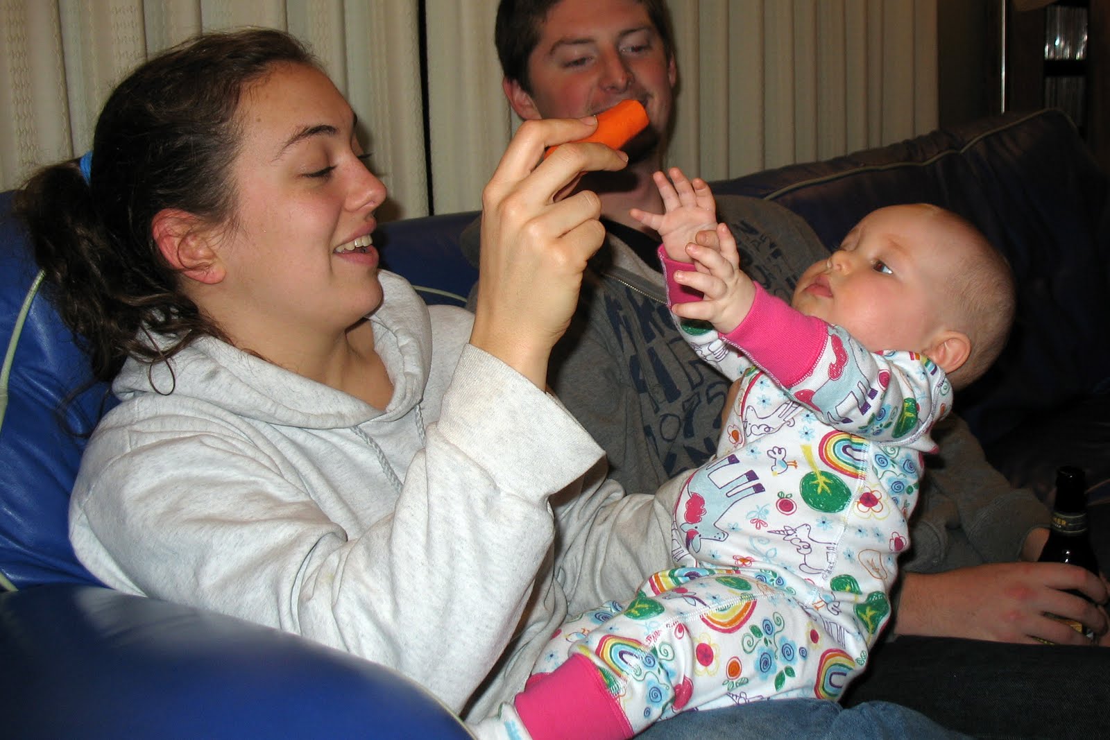 Josie was finally able to really eat some food this Thanksgiving weekend, after much anticipation and drooling over just about everything we eat. The first thing we tried was carrots, which she liked. Second was squash, which she LOVED! It was an amazingly positive reaction toward solid food, and by the second try with squash it was obvious she was really swallowing some bites. Here are a couple of pictures of our messy eater, and there is also a video which we will add later.